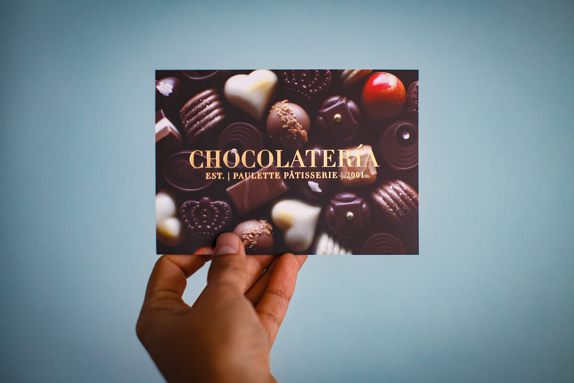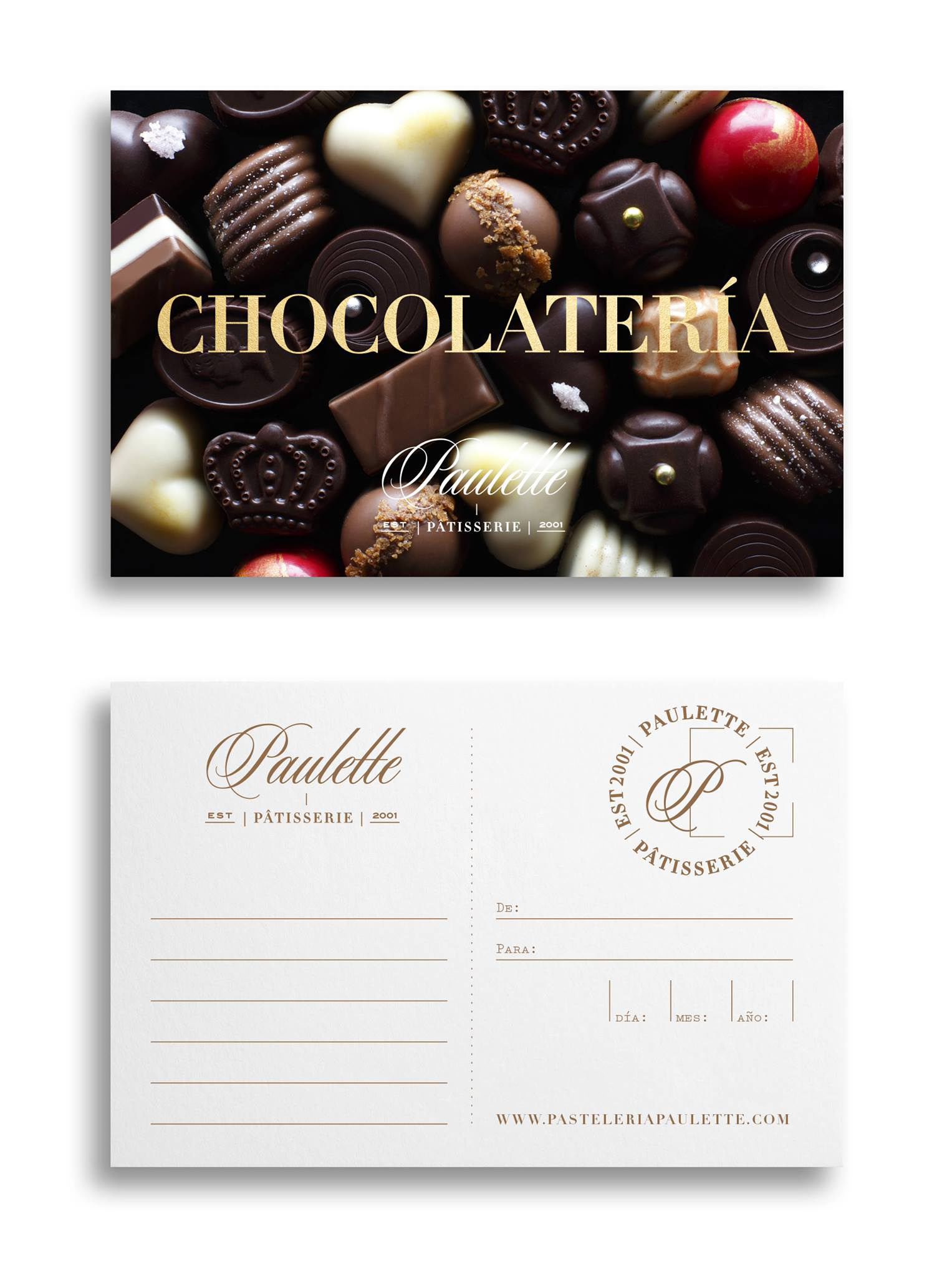 Postales realizadas para Pastelería Paulette, para promocionar su gama de chocolates. Fotografía: Gilberto Torres Retoque: Zinegraph Studio Diseño: Zinegraph Studio
